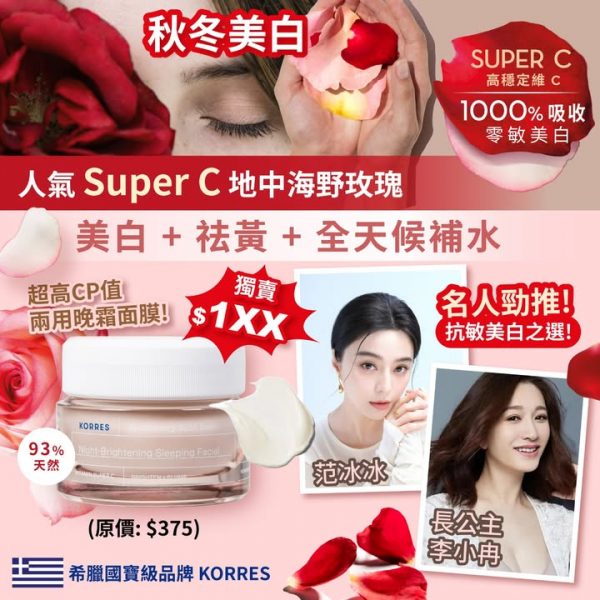 以地中海野玫瑰萃取而成的美白配方🌹 配合比普通純維C更高效1000%, 高穩定性的專利Super C成分,突破美容界的局限,實現美白淡班同時抗敏的願望‼