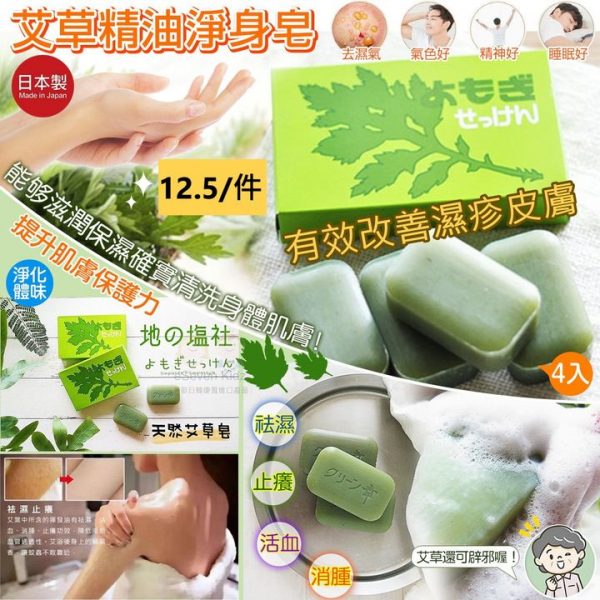 🇯🇵日本製熊本阿蘇艾草精油淨身皂 (80g*4), 原價$180/盒, ✈️E7日本直送, 最平只係$49/盒, 😁😁除開只係$12.5/件, 勁抵用呀👍👍