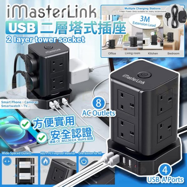 😼街邊買的拖板未必符合安全標準, 隨時🔥著火, 引起火警! 全新款式IMASTERLINK 拖兩層塔式插座符合多個🌎國際安全標準,夠晒安全, 👍👍配有開關和4個 USB 充電位, 夠晒方便, USB插頭唔會佔用本身嘅插蘇位, 最多可以义到12樣電子產品,如智能手機、遊戲機等,無需等待空閒插座。這樣的設計讓您能夠輕鬆應付多裝置的充電需求,並提高充電效率。