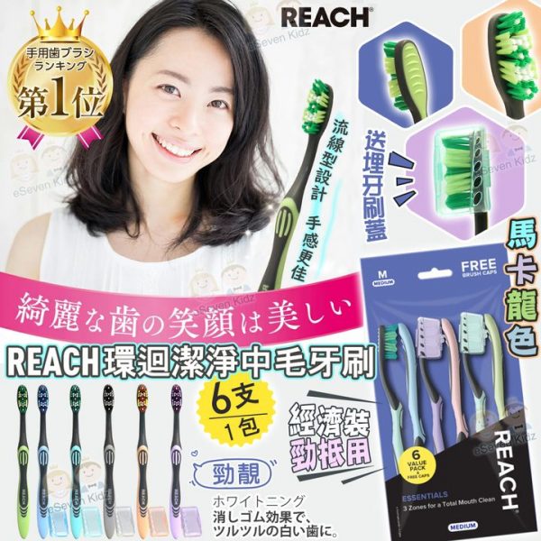[X402227Z] [限量現貨] 👏👏日本銷售NO.1 🏆手動牙刷‼️🇯🇵日本人氣牙刷 REACH 環迴潔淨中毛牙刷 (6支裝), 🪓🪓香港賣成$4X/支, E7開心價, 除開只係$8/枝, $48/包 😸😸