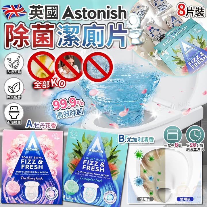 ⛔️謝謝支持,已截單了⛔已收到付款資料和訂單編號的客人,請於3個工作天內付款, 我們已幫你訂貨了![E412052] 👏👏清潔、除菌一次過搞掂🙌。一粒可以除去99% 細菌🦠,仲有陣陣香味🌸🌼 英國🇬🇧直送✈️Astonish 廁所清潔丸 (1盒8粒), 供應商年尾大平賣低至$28/盒😻😻 $36/盒 $28/盒 (2盒或以上)🌸🌼2款香味選: A. 牡丹花香 B. 尤加利清香 (📌下單時請選擇喜好款式)廁所大家日日都用,但其實危機處處!好容易傳播細菌!🦠🦠, 唔好俾病毒有機可乘!💪💪咁就要勤清潔呢款英國進口嘅Astonish廁所清潔丸深受歐洲人士喜愛😉😉, 只需放一粒入廁所(非水箱), 簡簡單單,無須刷洗,等候20分鐘再沖廁,即可擁有香氣清新的潔淨座廁,更有效殺滅 99.9%細菌。 強效分解座厠內的隱藏污垢,同時消除因細菌引起的異味。就可以有效清潔廁所同喉管~😁😁 仲可以除污除垢,真係好用又方便!😏😏 廁所乾淨又香噴噴~🌺✨ 大家真係要時刻清潔,保持衛生!😌😌• 有效消毒、除臭及清潔座廁 • 長效殺滅 99.9% 細菌 • 香氣持久清新✅ 用於馬桶位置,請勿使用於水箱 ✅ 使用1粒:基本清潔;使用2粒:強效去污 ✅ 高效清潔除垢 ✅ 請勿與漂白劑混合使用• 每包 8 片 • 波蘭製造🔸🔸🔸🔸🔸🔸🔸🔸🔸🔸🔸🔸🔸🔸🔸 (預計到港日期: 2024年12月尾) [E412052] 英國Astonish 廁所清潔丸 (1盒8粒) $36/盒 $28/盒 (2盒或以上) **本店接受支付寶HK, WECHAT PAY HK, 八達通(必須到店付)**取貨方式: A. 佐敦門巿取 B. E7 聯乘順豐智能櫃/順豐站優惠 $18起 (此為本公司提供之優惠價格, 需預先入帳)* (需指定順豐櫃或順豐站,但不包括送工商,住宅和便利店) C. TGS 本地派送服務(包住宅) +$30起 (優惠價格需先入帳) D. 順豐到付 (可以順豐站/工商區/上門) 此產品到付約$30起,運費以順豐最終收費為準 *智能櫃/順豐站優惠需受條款與限制約束 **TGS 本地派送服務 (Trinity Global Solutions Ltd) https://www.trinitygs.com/^^為方便統一計算訂貨數量, 請大家盡量在POST 下留言, 多謝幫忙購買方法: 1.如要購買請在貨品下留言, 請注明款式, 尺碼和數量 (如有) 2.同事會於24小時內回覆落單和入數資料 3.麻煩於3個工作天內入數和PM 入數紙 (客人若要寄貨請在付款後通知: 收件人姓名, 地址和聯絡電話, 若沒注明, 收貨時間會有延誤) 4 收到入數後我們會跟你確認, 貨到後我們會再通知你來取貨或郵寄寄出~POST上會註明大約到貨日期, 我們收到入數後會安排訂貨, 貨到會PM 通知客人, 如果貨品訂不到或供應商出貨有問題, 我們會全數退款。門巿地址: 佐敦上海街42-46號忠和商業中心9樓01室 (佐敦地鐵站C2出口) 辦公時間: 星期一至五: 10:00-19:00, 星期六: 11:00-4:00 (星期日及公眾假期休息)^^歡迎PM查詢批發^^#清潔 #除菌 #細菌 #有陣陣香味!! #英國直送 #Astonish #廁所 #清潔丸