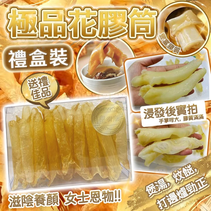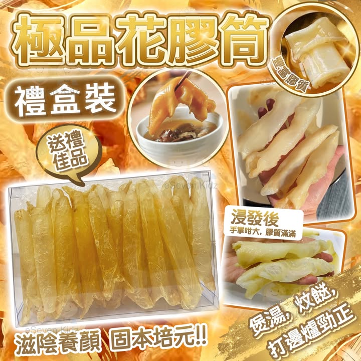 ⛔️謝謝支持,已截單了⛔已收到付款資料和訂單編號的客人,請於3個工作天內付款, 我們已幫你訂貨了![H412114] 👏👏今年最抵食, 浸發後實怕,成隻手掌咁長 🙀🙀SOGx買好貴起碼過$500盒, 海味店老闆益大家, 最平只係158/盒咋, 🎁仲要係禮盒裝, 送禮自用都🉐 皇御膳極品花膠筒(禮盒裝) $168/盒 $158/盒 (2盒或以上)🎊今次趁年尾介紹呢款極品花膠筒俾大家,👍色澤金黃,靚仔到不得了,😁泡發力驚人,唔會煲煲下失左踪,🏡最岩屋企一家幾口,實用性超強。👉呢批極品花膠筒,✌🏻系今年最抵買,性價比最強,✅每包有28-33隻,可分4次,中size, 膠質豐富,😋泡發出來成隻手掌咁大,鋸個小型扒都唔過分。😍花膠係女人💃之寶,滋陰養顏,花膠年年漲價,想食靚花膠真係唔易,呢個價可一不可再,要買就快手😍快快一家大細齊齊粗食花膠😋無論燉花膠鮮奶、燉湯、炆煮、炆餸、打邊爐都咁正😍經濟又美味👍🏻 喪食都唔肉痛丫😍晚晚都咁夜訓😩梗係要煲返d花膠湯飲下啦😋👉【浸發】 先清洗,水滾後放入花膠,滾3-4分鐘熄火,取出用一個大膠箱開水浸過花膠面,放入雪櫃浸5-6小便可🦾營養: 中醫角度,花膠具食療功效,它補而不燥👍🏻,可主治身虛體弱,腎臟機能衰退👍🏻,精稀薄少,又能長腰力👍🏻,調理五臓機能,更有滋陰、固腎功效👍🏻,被女仕視為養顔珍品😍。從營養角度,含豐富蛋白質,當中含高黏性的膠原蛋白質👍🏻,豐富骨膠原和黏多糖,可改善新陳代謝和防止皮膚老化👍🏻。內含之磷質、鈣質、脂肪和鐵質,可助人體迅速消除疲勞👍🏻,對外科手術病人傷口之恢復也有幫助。📌食用期限:25.12.2027 📌儲存方法:需放於陰涼乾爽處 📌規格: 約100g (28-33隻)🔸🔸🔸🔸🔸🔸🔸🔸🔸🔸🔸🔸🔸🔸🔸 (預計到港日期: 2025年1月中) [H412114] 皇御膳極品花膠筒(禮盒裝) $168/盒 $158/盒 (2盒或以上) **本店接受支付寶HK, WECHAT PAY HK, 八達通(必須到店付)**取貨方式: A. 佐敦門巿取 B. E7 聯乘順豐智能櫃/順豐站優惠 $18起 (此為本公司提供之優惠價格, 需預先入帳)* (需指定順豐櫃或順豐站,但不包括送工商,住宅和便利店) C. TGS 本地派送服務(包住宅) +$30起 (優惠價格需先入帳) D. 順豐到付 (可以順豐站/工商區/上門) 此產品到付約$30起,運費以順豐最終收費為準 *智能櫃/順豐站優惠需受條款與限制約束 **TGS 本地派送服務 (Trinity Global Solutions Ltd) https://www.trinitygs.com/^^為方便統一計算訂貨數量, 請大家盡量在POST 下留言, 多謝幫忙🙏購買方法: 1.如要購買請在貨品下留言, 請注明款式, 尺碼和數量 (如有) 2.同事會於24小時內回覆落單和入數資料 3.麻煩於3個工作天內入數和PM 入數紙 (客人若要寄貨請在付款後通知: 收件人姓名, 地址和聯絡電話, 若沒注明, 收貨時間會有延誤) 4 收到入數後我們會跟你確認, 貨到後我們會再通知你來取貨或郵寄寄出~POST上會註明大約到貨日期, 我們收到入數後會安排訂貨, 貨到會PM 通知客人, 如果貨品訂不到或供應商出貨有問題, 我們會全數退款。門巿地址: 佐敦上海街42-46號忠和商業中心9樓01室 (佐敦地鐵站C2出口) 辦公時間: 星期一至五: 10:00-19:00, 星期六: 11:00-4:00 (星期日及公眾假期休息)^^歡迎PM查詢批發^^#年最抵食 #花膠筒 #禮盒
