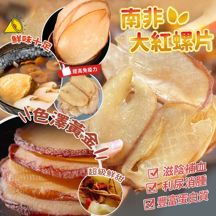 ⛔️謝謝支持,已截單了⛔已收到付款資料和訂單編號的客人,請於3個工作天內付款, 我們已幫你訂貨了![H411281] 👏🏻👏🏻新一批又平又靚呀😁😁,今次係大紅螺, 特別香甜, 百搭煲湯恩物😋 南非大紅螺片,大大包 600g 低至$129/ 包‼️ $139/包 $129/包 (2包或以上)將近年尾只會越嚟越貴,趁而家平快啲入定貨啦😌🌈大大塊靚靚南非黃金螺片🐚 一打開已經聞到香甜味🉐 螺中霸王 👑 色澤金黃大塊, 唔洗出水唔洗浸,冲一冲水就可以煲,非常方便🉐 煲湯放幾塊就能帶出鮮味😍🔸🔸🔸🔸🔸🔸🔸🔸🔸🔸🔸🔸🔸🔸🔸 (預計到港日期: 2024年12月中) [H411281] 南非大紅螺片 $139/包 $129/包 (2包或以上) **本店接受支付寶HK, WECHAT PAY HK, 八達通(必須到店付)**取貨方式: A. 佐敦門巿取 B. E7 聯乘順豐智能櫃/順豐站優惠 $18起 (此為本公司提供之優惠價格, 需預先入帳)* (需指定順豐櫃或順豐站,但不包括送工商,住宅和便利店) C. TGS 本地派送服務(包住宅) +$30起 (優惠價格需先入帳) D. 順豐到付 (可以順豐站/工商區/上門) 此產品到付約$30起,運費以順豐最終收費為準 *智能櫃/順豐站優惠需受條款與限制約束 **TGS 本地派送服務 (Trinity Global Solutions Ltd) https://www.trinitygs.com/^^為方便統一計算訂貨數量, 請大家盡量在POST 下留言, 多謝幫忙購買方法: 1.如要購買請在貨品下留言, 請注明款式, 尺碼和數量 (如有) 2.同事會於24小時內回覆落單和入數資料 3.麻煩於3個工作天內入數和PM 入數紙 (客人若要寄貨請在付款後通知: 收件人姓名, 地址和聯絡電話, 若沒注明, 收貨時間會有延誤) 4 收到入數後我們會跟你確認, 貨到後我們會再通知你來取貨或郵寄寄出~POST上會註明大約到貨日期, 我們收到入數後會安排訂貨, 貨到會PM 通知客人, 如果貨品訂不到或供應商出貨有問題, 我們會全數退款。門巿地址: 佐敦上海街42-46號忠和商業中心9樓01室 (佐敦地鐵站C2出口) 辦公時間: 星期一至五: 10:00-19:00, 星期六: 11:00-4:00 (星期日及公眾假期休息)^^歡迎PM查詢批發^^#又平又靚呀 #大紅螺 #特別香甜 #百搭 #煲湯恩物 #南非 #大紅螺片